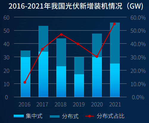 2021年,,,,,我国光伏新增装机量54.8GW,同比增添13.9%,,,,,其中漫衍式新增29.28GW,占比53.4%,,,,,与历史上首次突破50%。。。。