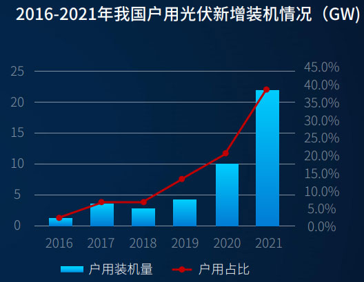 2021年,,,,,我国户用光伏新增装机量21.6GW,创历史新高,,,,,占我国新增装机量的39.4%,,,,,同比增添113.3%。。。。